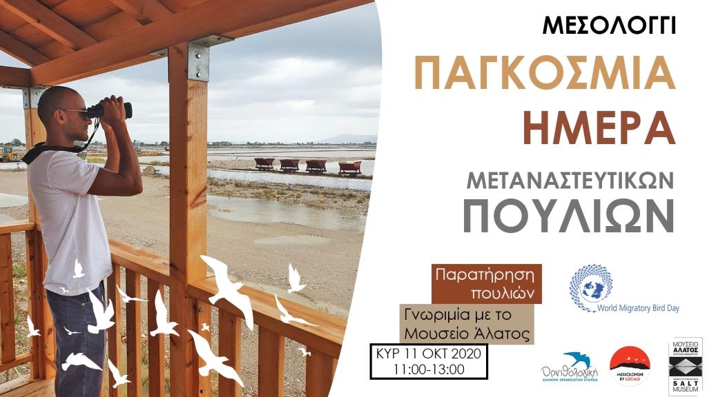 Το Messolonghi by Locals σε συνεργασία με το Μουσείο Άλατος και την Ελληνική ΟΡΝΙΘΟΛΟΓΙΚΗ Εταιρεία σας προσκαλούν την Κυριακή 11 Οκτωβρίου, ώρες 11:00-13:00, να συμμετάσχετε στην Παγκόσμια Ημέρα Μεταναστευτικών Πουλιών. Η φετινή γιορτή στέλνει το μήνυμα: “Τα πουλιά συνδέουν τον κόσμο μας”.