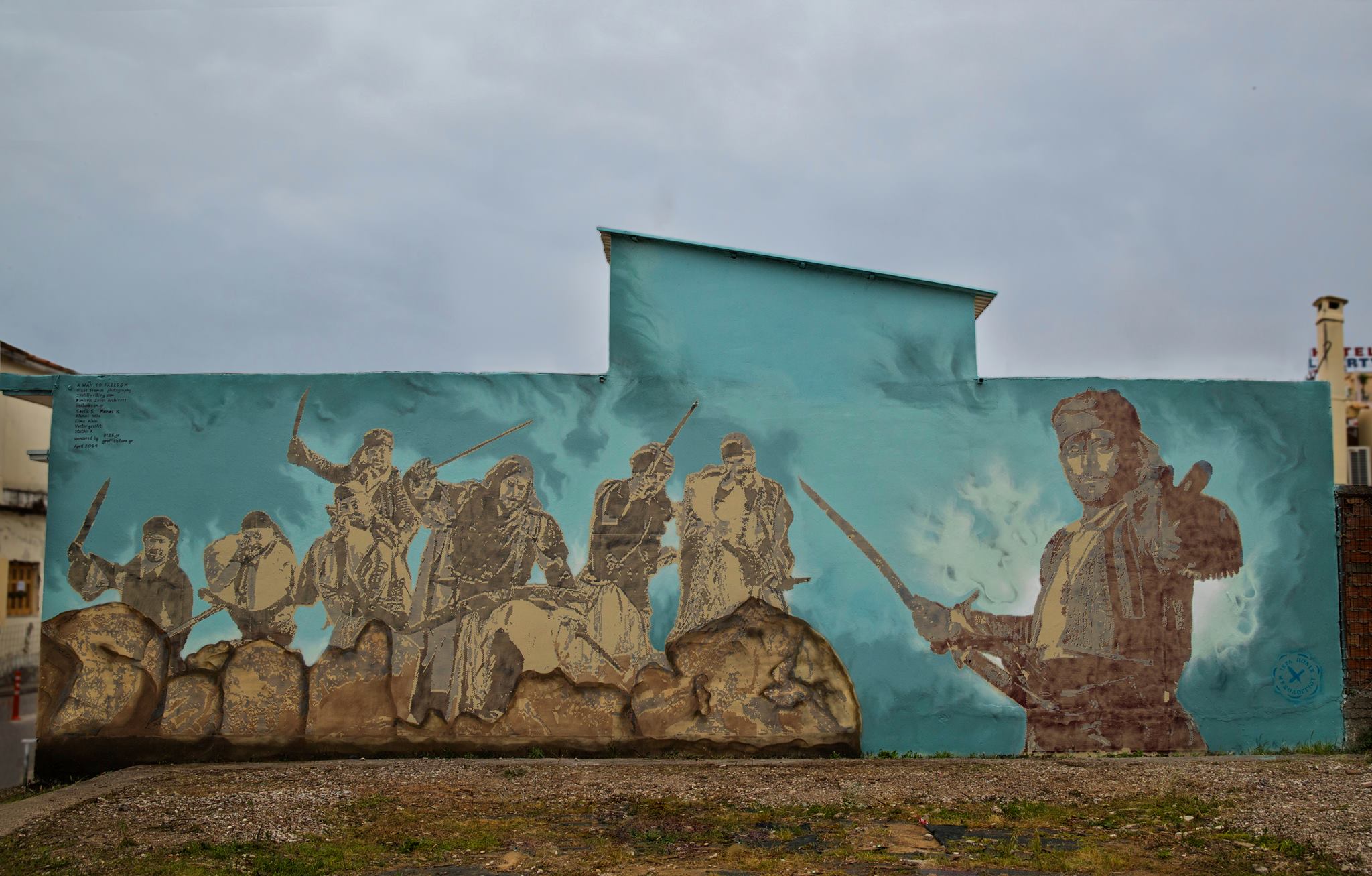 Δεν γίνεται να μην κάνω αναφορά και στην αποτύπωση φωτογραφίας του, με graffiti που κοσμεί σαν πίνακας, κεντρικό τοίχο, την είσοδο της πόλης, μια σημαντική συνεργασία με τον Γιώργο Παπαγεωργίου και τον Δημήτρη Ζέλιο όπου ήρωες της Εξόδου έχουν αποτυπωθεί με την μέθοδο του laser cut dot stencil graffiti .