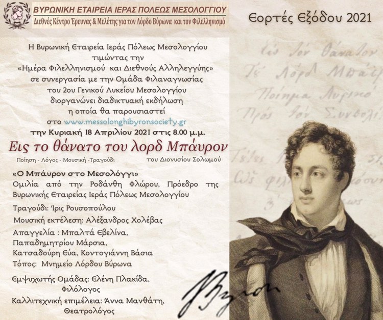 Η Βυρωνική Εταιρεία Ιεράς Πόλεως Μεσολογγίου τιμώντας την «Ημέρα Φιλελληνισμού και Διεθνούς Αλληλεγγύης 2021» σε συνεργασία με την ομάδα Φιλαναγνωσίας του 2ου Γενικού Λυκείου Μεσολογγίου σας προσκαλεί στην διαδικτυακή εκδήλωση η οποία θα παρουσιαστεί την Κυριακή 18 Απριλίου, στις 20:00 από την ιστοσελίδα της Βυρωνικής Εταιρείας www.messolonghibyronsociety.gr