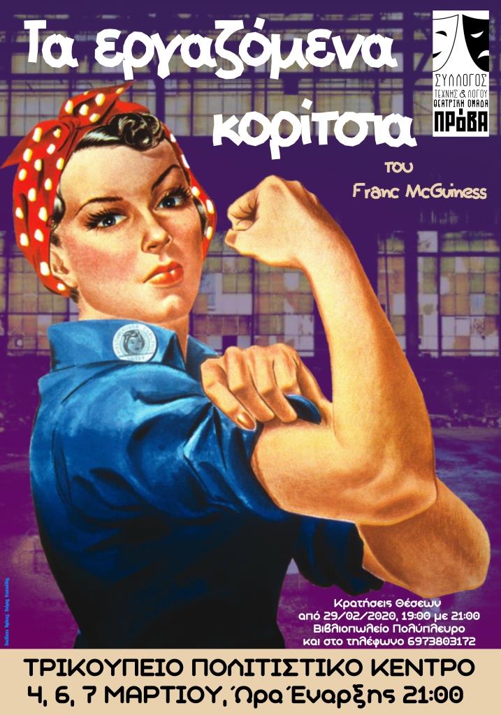Ο Σύλλογος Τέχνης & Λόγου Θεατρική Ομάδα «Πρόβα» Ιεράς Πόλεως Μεσολογγίου θα παρουσιάσει στο Τρικούπειο Πολιτιστικό Κέντρο στις 4,6,7 Μαρτίου και ώρα 21.00 το έργο του Frank Mc Guiness «Τα εργαζόμενα Κορίτσια».