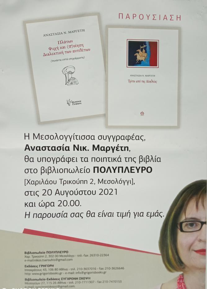 Την Παρασκευή 20 Αυγούστου και ώρα 20:00 η συγγραφέας Αναστασία Μαργέτη παρουσιάζει και υπογράφει τα ποιητικά της βιβλία στο βιβλιοπωλείο ΠΟΛΥΠΛΕΥΡΟ επι της οδού Χαριλάου Τρικούπη 2 στο Μεσολόγγι.