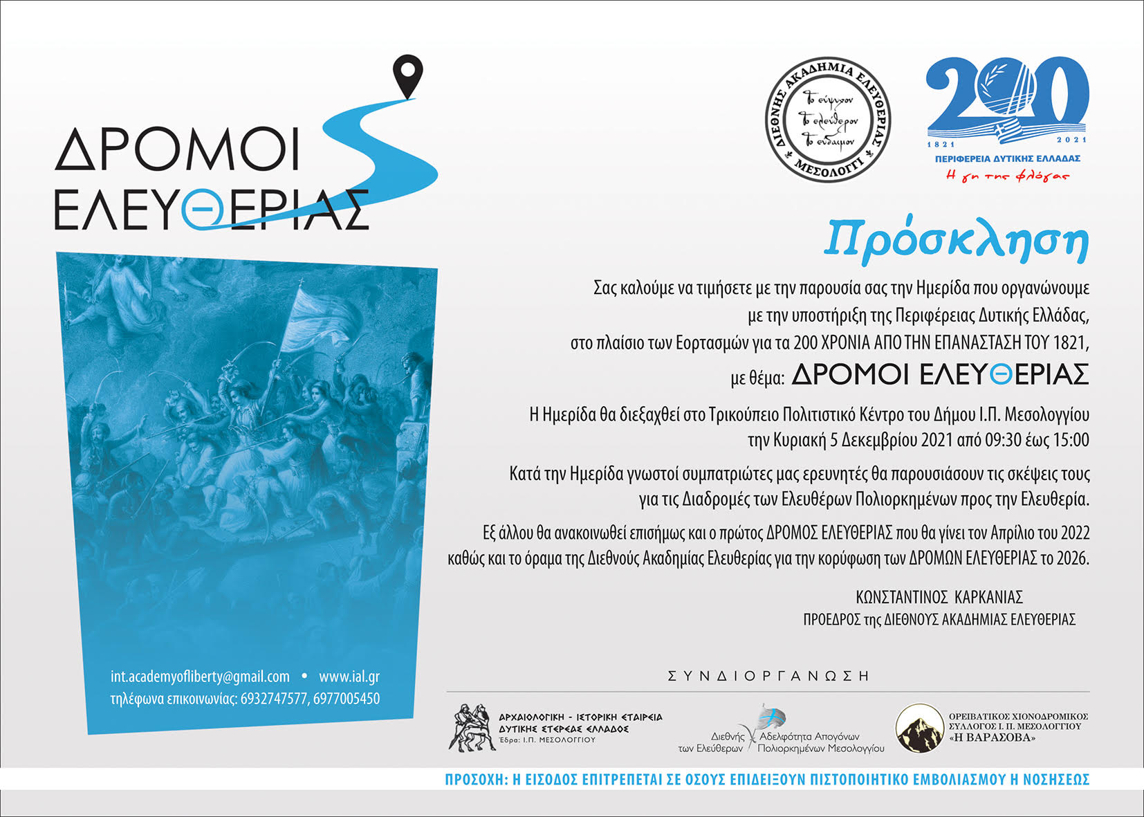 Η Διεθνής Αδελφότητα Απογόνων των Ελεύθερων Πολιορκημένων Μεσολογγίου διοργανώνει ημερίδα με την υποστήριξη της Περιφέρειας με θέμα «Δρόμοι Ελευθερίας» την Κυριακή 5 Δεκεμβρίου στο Τρικούπειο Πολιτιστικό Κέντρο.