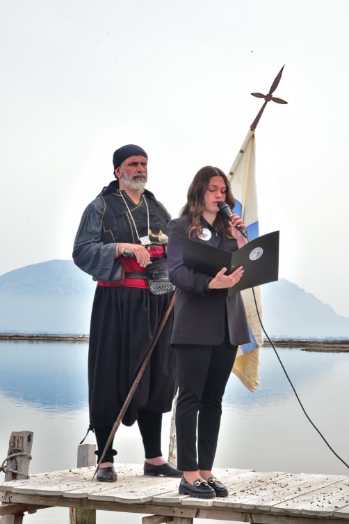Στην συνέχεια η Γραμματέας του Δ.Σ του Ομίλου, κα Δήμητρα Βραχά, αναφέρθηκε στην ανδρεία των αγωνιστών και την μαχητικότητα των 131 αγωνιστών, οι οποίοι μαχόμενοι, εξολόθρευσαν περίπου 3.000 Οθωμανούς, βάφοντας κόκκινη με το αίμα τους τη λιμνοθάλασσα.