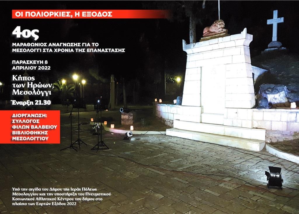 Ο 4ος Μαραθώνιος Ανάγνωσης για το Μεσολόγγι στα χρόνια της Επανάστασης, που διοργανώνει ο Σύλλογος των Φίλων της Βαλβείου Βιβλιοθήκης, θα διεξαχθεί την Παρασκευή 8 Απριλίου 2022, από τις 9.30 μ.μ. ως τα μεσάνυχτα, στον Κήπο των Ηρώων στο πλαίσιο των εκδηλώσεων του δήμου Ιεράς Πόλεως Μεσολογγίου για την 196η επέτειο της Εξόδου των Ελεύθερων Πολιορκημένων.