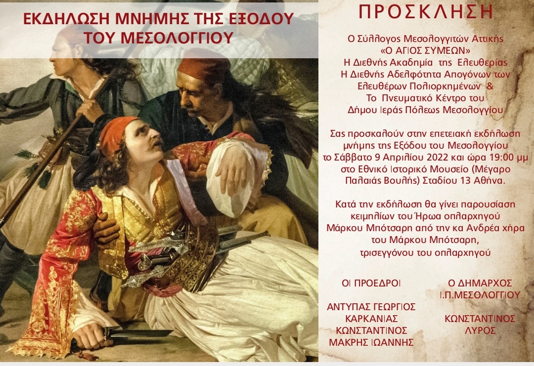 Στα πλαίσια των Εορτών Εξόδου θα λάβει χώρα μια ιδιαίτερη και συγκινητική εκδήλωση αφιερωμένη στον ηρώα και αγωνιστή Μάρκο Μπότσαρη. Η εκδήλωση θα πραγματοποιηθεί το Σάββατο 9 Απριλίου 2022 στις 7.00 μ.μ. στο Εθνικό Ιστορικό Μουσείο (Μέγαρο Παλαιάς Βουλής) στην Αθήνα.