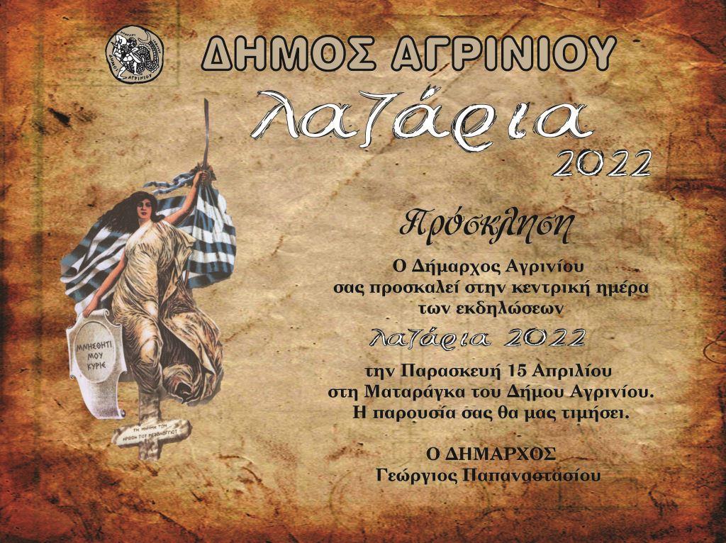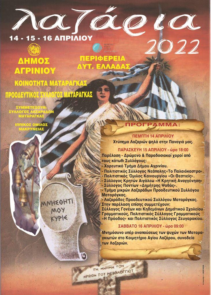 Από την Πέμπτη 14 Απριλίου έως το Σάββατο 16 Απριλίου πραγματοποιούνται οι εορταστικές εκδηλώσεις «Λαζάρια 2022», στη Ματαράγκα.