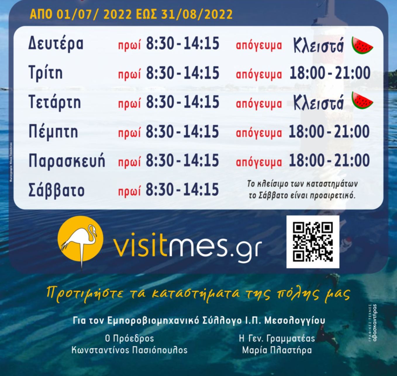 Εμποροβιομηχανικός Σύλλογος Ι.Π Μεσολογγίου: Θερινό Ωράριο λειτουργίας καταστημάτων