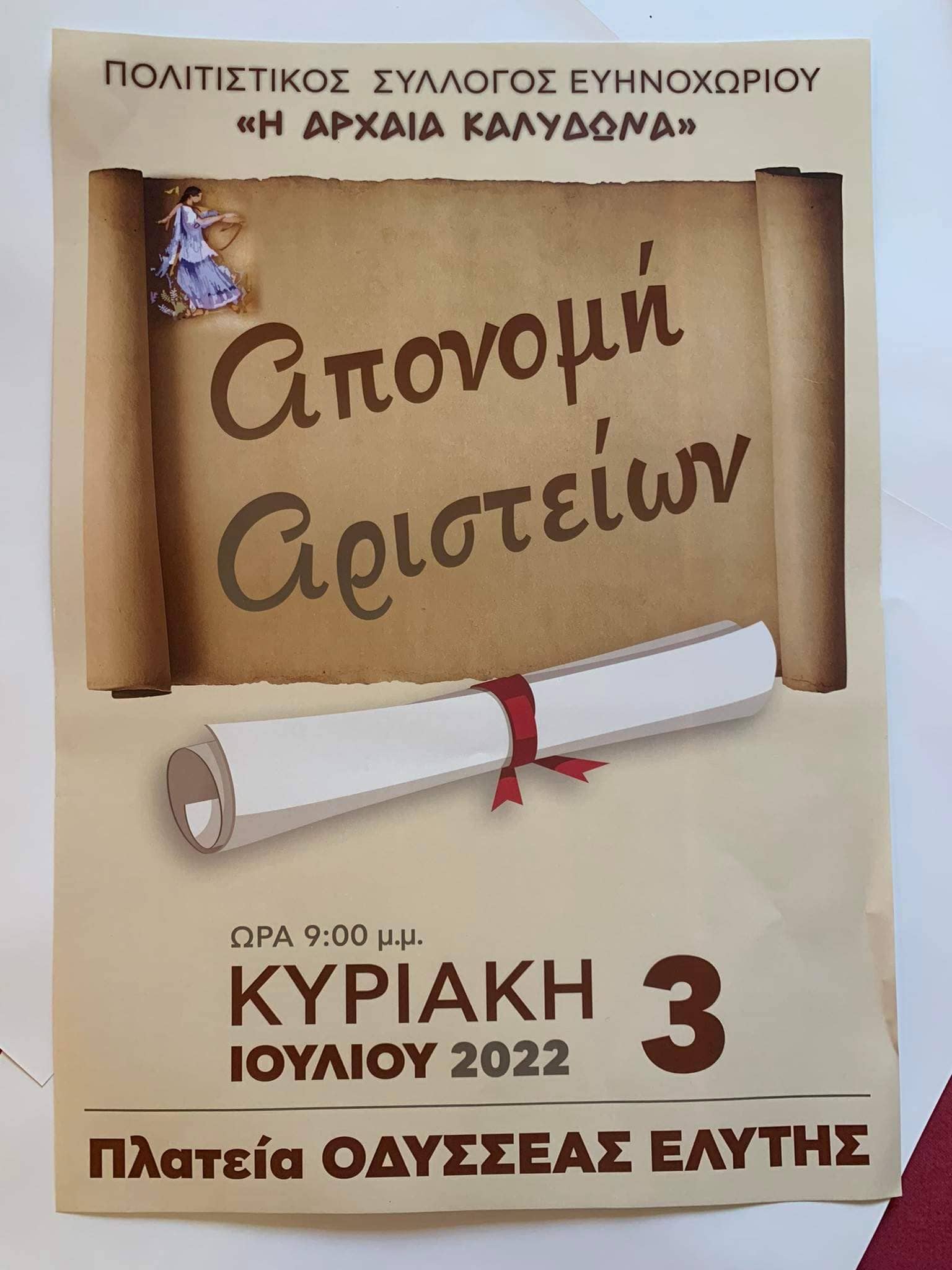 Ο Πολιτιστικός Σύλλογος «Η Αρχαία Καλυδώνα» την Κυριακή 3 Ιουλίου 2022 στην πλατεία Οδυσσέας Ελύτης, και ώρα 21:00 διοργανώνει την ετήσια εκδήλωσή του, απονομής αριστείων για τους αριστούχους μαθητές των σχολείων του Ευηνοχωρίου.