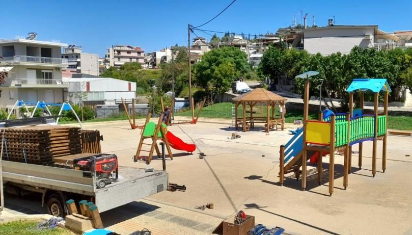 Έχει ήδη ξεκινήσει η εγκατάσταση των οργάνων όπως κούνιες, τσουλήθρα, ξύλινο κιόσκι για την άθληση νηπίων και παιδιών. Θα ακολουθήσει η τοποθέτηση δαπέδων ασφαλείας.