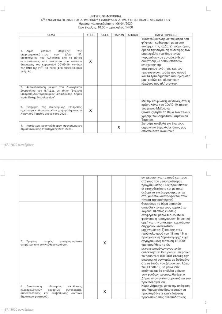 Κύριε Πρόεδρε του Δημοτικού μας συμβουλίου, Λάβαμε την πρόσκλησή σας για συμμετοχή στο πρώτο δημοτικό συμβούλιο δια περιφοράς. Όπως θα είδατε εκ του αποτελέσματος, συμμετείχε σχεδόν όλη η δημοτική μας ομάδα θέλοντας να στηρίξουμε με την ψήφο μας όχι μόνο την διαδικασία που προβλέπει το Υπουργείο Εσωτερικών αλλά και σημαντικές αποφάσεις που έχουν να κάνουν με την τοπική μας κοινωνία.