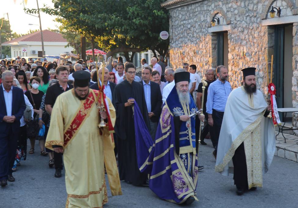 Ο Σεβασμιώτατος χοροστάτησε στην ακολουθία του μεθέορτου πανηγυρικού Εσπερινού και στη συνέχεια προεξήρχε στην λιτάνευση της ιεράς Εικόνος της Υπεραγίας Θεοτόκου στους δρόμους του χωριού.
