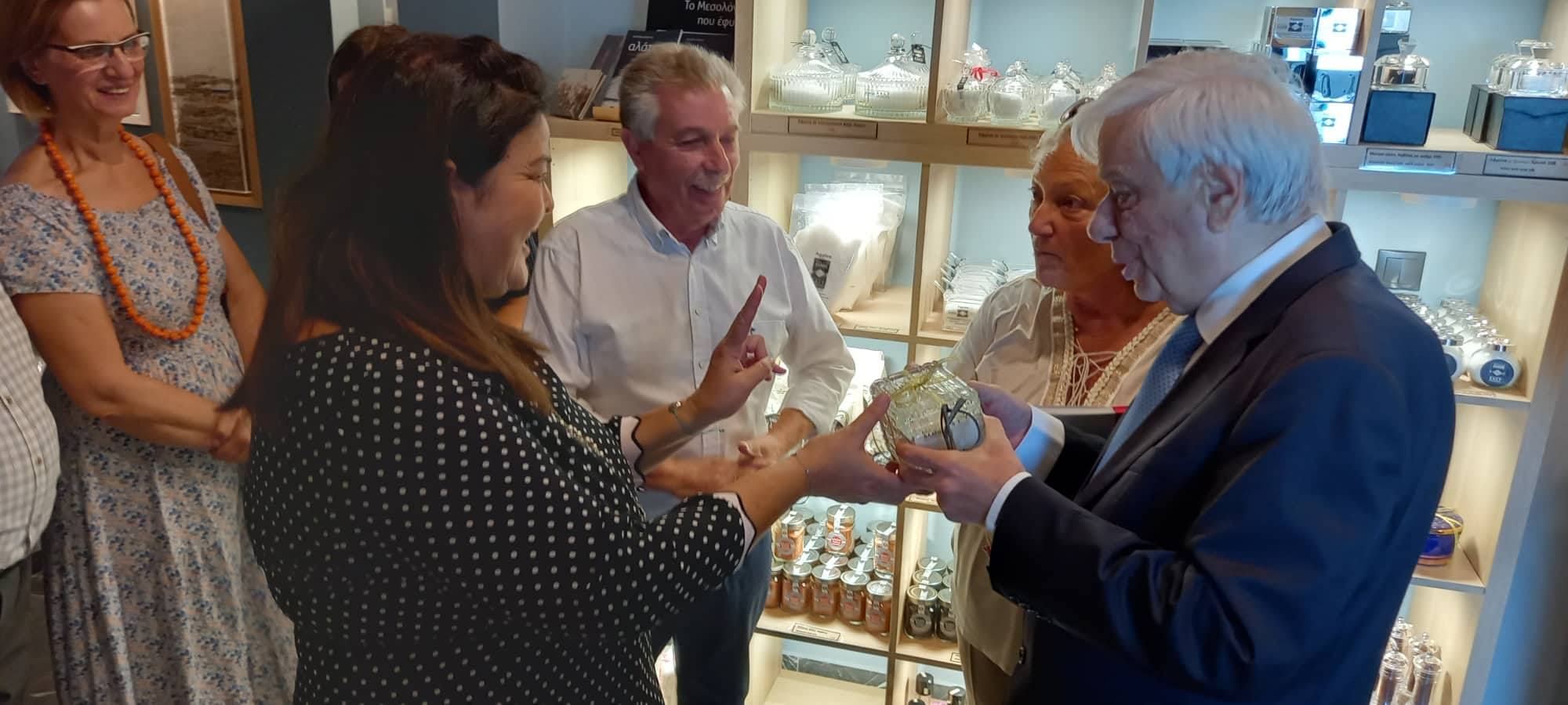 Τον πρόεδρο ξενάγησε η διευθύντρια του Μουσείου Δέσποινα Κανελλή, η οποία σαν ανάμνηση του δώρισε μία κρυστάλλινη κοσμηματοθήκη του 1922 προερχόμενη από την Μικρά Ασία γεμάτη με αλάτι αφρίνα αναμεμειγμένη με βρώσιμο χρυσό 24 καρατίων.