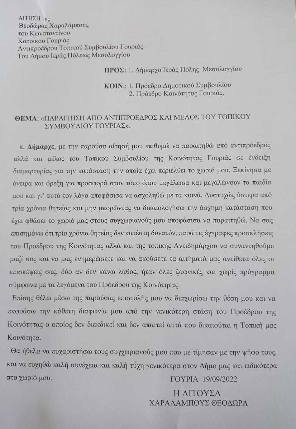 Επιστολή παραίτησης Θ. Χαραλάμπους από Αντιπρόεδρος και μέλος του Τοπικού Συμβουλίου Γουριάς
