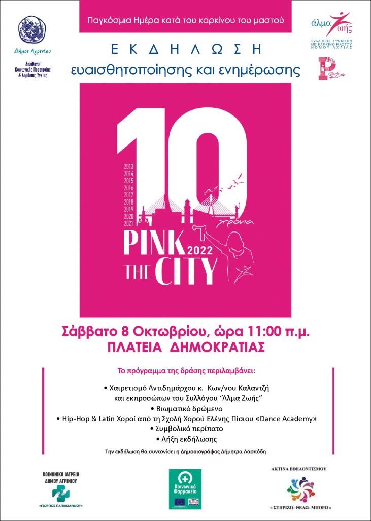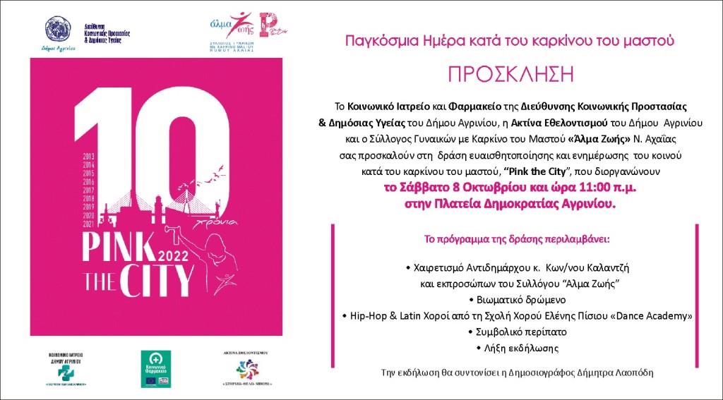 Το Κοινωνικό Ιατρείο και Φαρμακείο της Διεύθυνσης Κοινωνικής Προστασίας και Δημόσιας Υγείας του Δήμου Αγρινίου, η Ακτίνα Εθελοντισμού του Δήμου Αγρινίου και ο Σύλλογος Γυναικών με Καρκίνο του Μαστού «Άλμα Ζωής Ν. Αχαΐας» διοργανώνουν για 3 η συνεχόμενη χρονιά την δράση “Pink the City”, το Σάββατο 8 Οκτωβρίου και ώρα 11:00 π.μ. στην Πλατεία Δημοκρατίας.