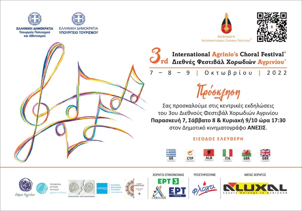 Την Παρασκευή 7 Οκτωβρίου ξεκινά το 3ο Διεθνές Φεστιβάλ Χορωδιών Αγρινίου που θα διαρκέσει έως και την Κυριακή 9 Οκτωβρίου, με ώρα έναρξης κάθε απόγευμα στις 17:30 στον Δημοτικό Κινηματογράφο ΑΝΕΣΙΣ.