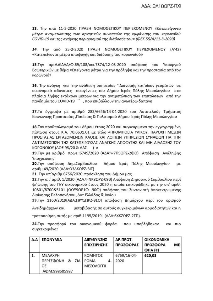 Αναγκάζομαι να απαντήσω απευθυνόμενη όχι σ’ αυτόν, ένα «καμμένο χαρτί», αλλά στους συνδημότες μου που πιθανόν να διερωτώνται μετά από τέτοια πονηρά και ύπουλα τεχνάσματα που απεργάζεται περί αναθέσεων κλπ. Τους γνωστοποιώ λοιπόν ότι η επιχείρησή μου ανέλαβε να δουλέψει τέσσερις μέρες από την Μεγάλη Παρασκευή μέχρι την Δευτέρα του Πάσχα για να ετοιμάσει φαγητό για 62 συνδημότες μας που έχουν ανάγκη και θα σιτιστούν με έξοδα του δήμου. Το κόστος για κάθε άτομο είναι δέκα ευρώ συμπεριλαμβανομένου του ΦΠΑ και φόρων και περιλαμβάνει πλήρες γεύμα με αρνί κλπ και την διανομή για 4 ημέρες σε 62 διαφορετικούς ανθρώπους.