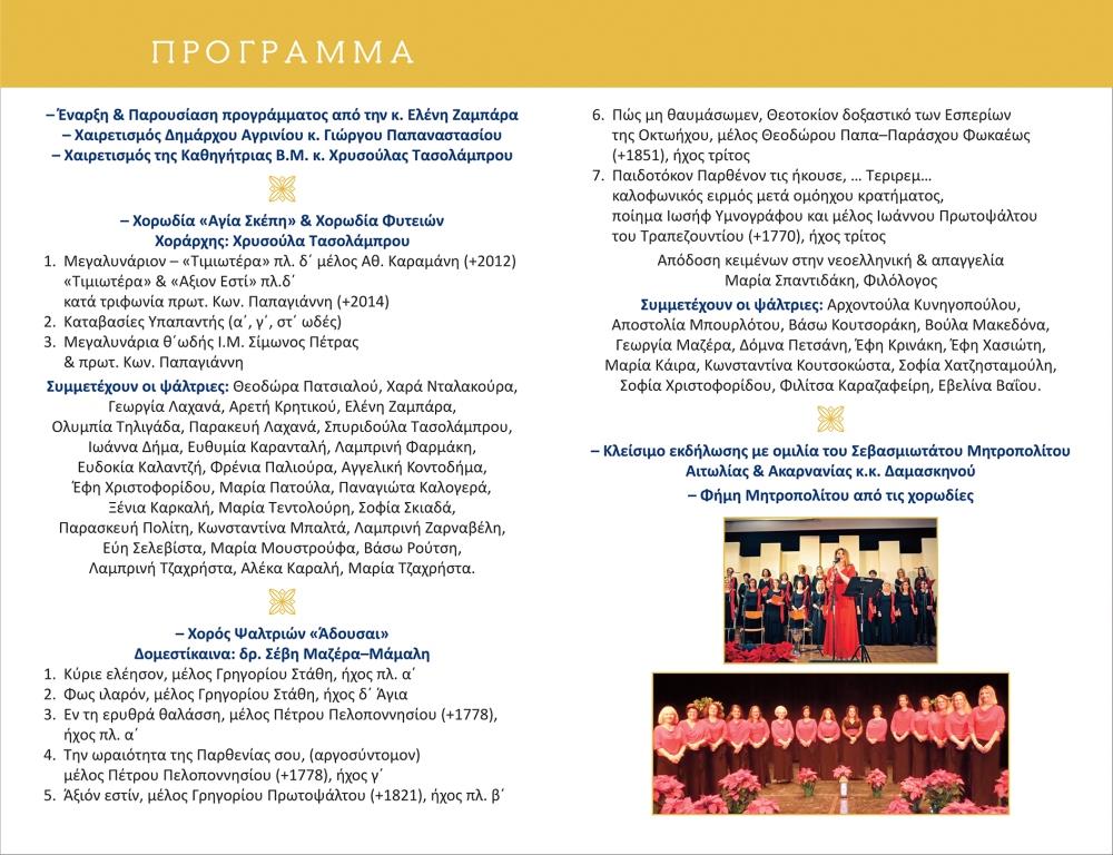 Η εκδήλωση θα πραγματοποιηθεί στον Ιερό Ναό Αγίας Τριάδας Αγρινίου στις 18:30 και τελεί υπό την αιγίδα του Υπουργείου Πολιτισμού και της Ι.Μ. Αιτωλίας & Ακαρνανίας με τη συνδιοργάνωση της Περιφέρειας Δυτικής Ελλάδας, του Δήμου Αγρινίου και της ΠΕΔ Δυτικής Ελλάδας.