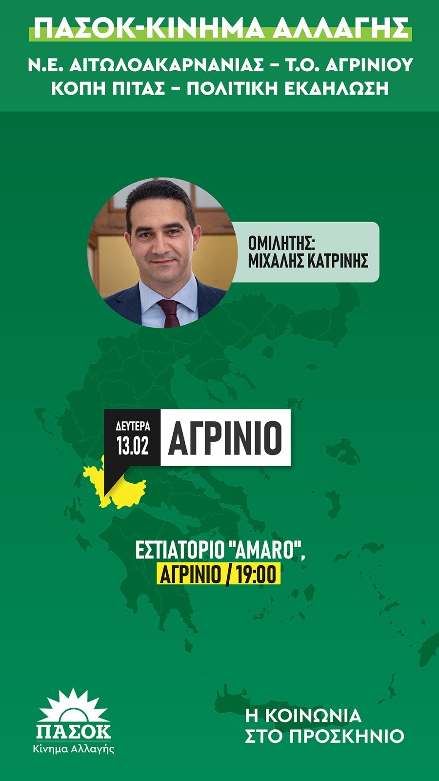 Καλεσμένος ομιλητής θα είναι ο Επικεφαλής της Κοινοβουλευτικής Ομάδας του ΠΑΣΟΚ, Μιχάλης Κατρίνης