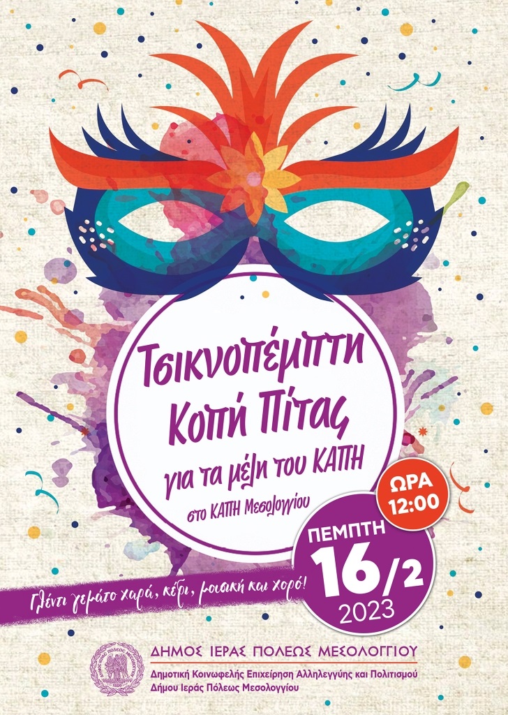 Γιορτή για τα μέλη του  Κ.Α.Π.Η. του Δήμου Ι.Π. Μεσολογγίου θα πραγματοποιηθεί την Τσικνοπέμπτη  και ακολούθως θα γίνει η κοπή της πρωτοχρονιάτικης πίτας.