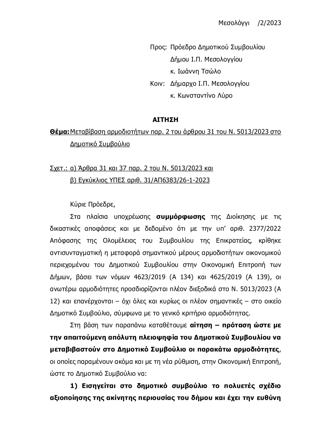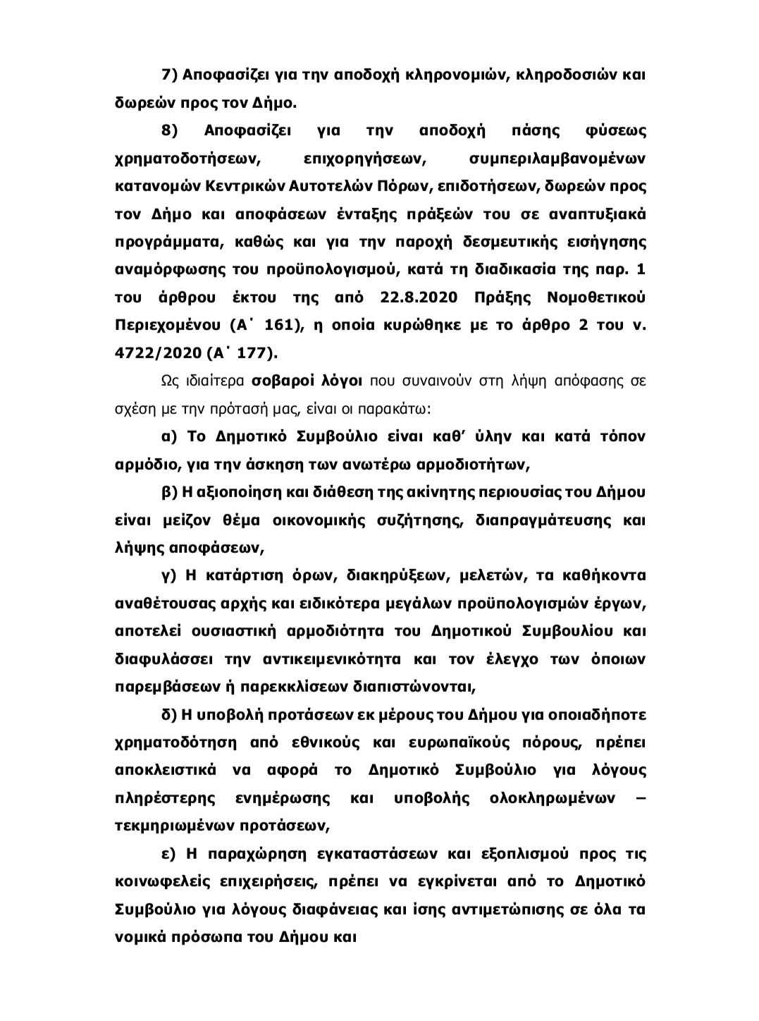 Το Δημοτικό Συμβούλιο κατά την τακτική του συνεδρίαση την 23- 2-2023 έλαβε με απόλυτη πλειοψηφία – όπως ο νόμος προβλέπει – μια ιστορική απόφαση αναφορικά με την μεταβίβαση αρμοδιοτήτων της Οικονομικής Επιτροπής σε αυτό, οι οποίες δεν εκχωρήθηκαν με τις πρόσφατες νομοτεχνικές βελτιώσεις – τροπολογία του Υπουργού ΥΠΕΣ κ. Βορίδη – στη βάση της σχετικής απόφασης (2377/2022) περί αντισυνταγματικότητας του ΣτΕ ως προς την αλλοίωση των αποτελεσμάτων των δημοτικών εκλογών του 2019, οι οποίες ήταν αντίθετες προς την βούληση των πολιτών.