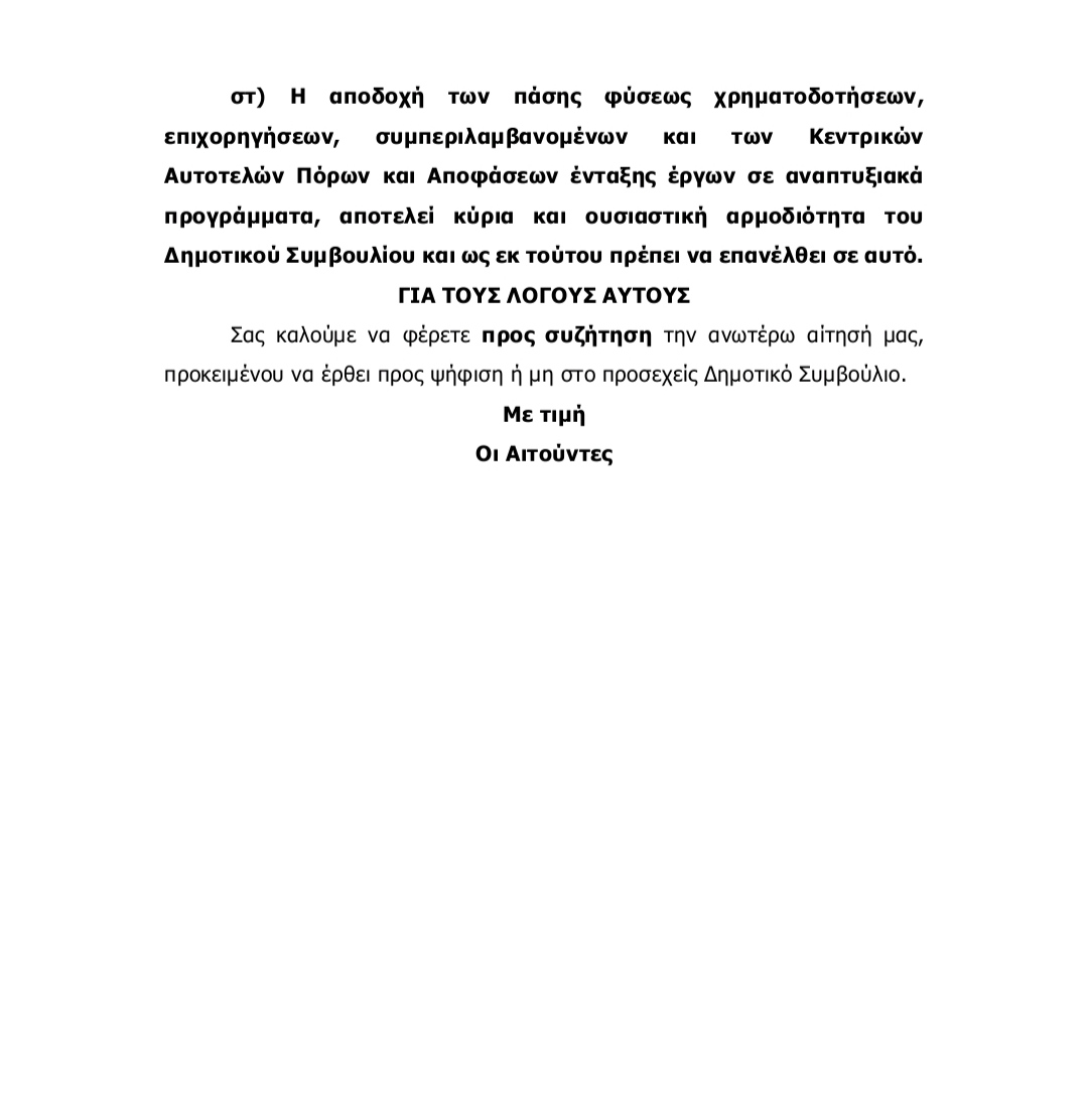 Για την ιστορία επί συνόλου 33 δημοτικών συμβούλων στη συγκεκριμένη ψηφοφορία, παρόντες ήταν 29, υπέρ ψήφισαν 17 και κατά 12. Ακολουθεί το κείμενο της αίτησης των 17 δημοτικών συμβούλων, στη βάση της οποίας ελήφθη η ως άνω απόφαση.