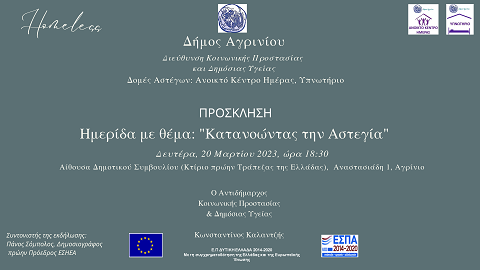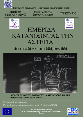 Οι Δομές Αστέγων Δήμου Αγρινίου, Υποέργο α/α 1:Ανοικτό Κέντρο Ημέρας και Υποέργο α/α 2: Υπνωτήριο (ΕΣΠΑ Δυτική Ελλάδα 2014-2020 με κωδ. ΟΠΣ: 5002126), της Διεύθυνσης Κοινωνικής Προστασίας και Δημόσιας Υγείας, διοργανώνουν ημερίδα ενημέρωσης και ευαισθητοποίησης με κεντρικό θέμα: “Κατανοώντας την Αστεγία”.