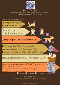 - Τη διαδικασία της υιοθεσίας των ζώων μετά την αποθεραπεία τους από ενήλικα άτομα ή φιλοζωικές ενώσεις και σωματεία (για το έτος 2022 έχουν γίνει από τον Δήμο Αγρινίου 131 υιοθεσίες).