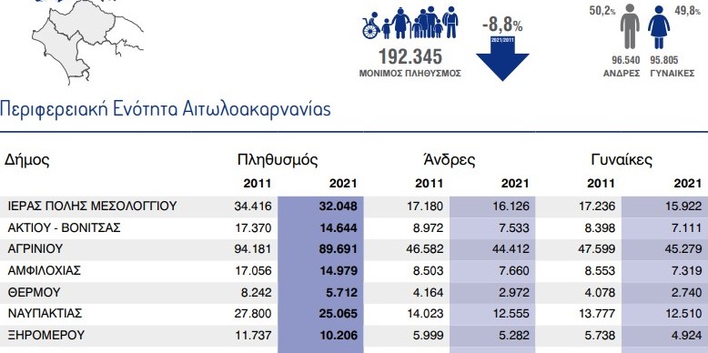 Στην Περιφέρεια Δυτικής Ελλάδας καταγράφεται μείωση του μόνιμου πληθυσμού κατά 4,6%. Η Περιφερειακή Ενότητα Αιτωλοακαρνανίας καταγράφει 192.345 κατοίκους. Όπερ σημαίνει μείωση του πληθυσμού κατά 8,8%.048 εξ αυτών στονΔήμο Μεσολογγίου(με την πόλη του Μεσολογγίου να καταγράφει 13.965 κατοίκους), 14.664 στον Δήμο Ακτίου-Βονίτσης, 14.979 στον Δήμο Αμφιλοχίας, 10.206 στον Δήμο Ξηρομέρου, 5.712 στον Δήμο Θέρμου και 25.065 στον Δήμο Ναυπάκτου (με την πόλη της Ναυπάκτου να συγκεντρώνει 12.950 κατοίκους).