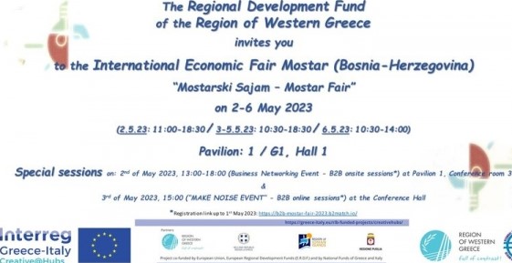 Κατά τη διάρκεια της Έκθεσης στο Mostar (2-6 Μαΐου 2023), το κοινό θα έχει την ευκαιρία να γνωρίσει τους τέσσερις Δημιουργικούς Κόμβους (CreativeHubs) που δραστηριοποιούνται και αναπτύσσονται στην Περιφέρεια Δυτικής Ελλάδας, ενώ θα δοθεί η ευκαιρία δικτύωσης με άλλους δημιουργικούς κόμβους και Β2Β συναντήσεων μεταξύ δημιουργικών ΜμΕ.