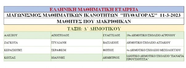 Οι μαθητές της Δ΄ τάξης δημοτικού της Αιτωλοακαρνανίας που διακρίθηκαν στον Πανελλήνιο Μαθητικό Διαγωνισμό Μαθηματικών «ΠΥΘΑΓΟΡΑΣ» της Ελληνικής Μαθηματικής Εταιρείας.