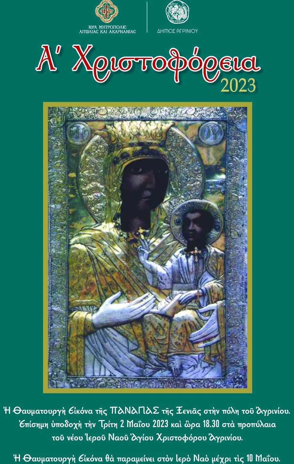 Στο πλαίσιο του εορτασμού του Αγίου Χριστοφόρου, πολιούχου του Αγρινίου και των εορταστικών εκδηλώσεων με τίτλο: «Α’ Χριστοφόρεια 2023» που θα πραγματοποιηθούν από 2 έως 10 Μαΐου 2023, η Ιερά Μητρόπολη Αιτωλίας και Ακαρνανίας και η πόλη του Αγρινίου θα υποδεχθούν την εφέστιο Ιερά Εικόνα της Παναγίας Ξενιάς, από την ομώνυμη Ιερά Μονή Κάτω Ξενιάς, της Ιεράς Μητροπόλεως Δημητριάδος και Αλμυρού.