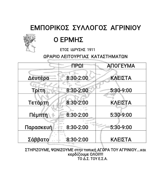 «Μετά την απόφαση της κυβέρνησης για την τμηματική και σταδιακή επαναλειτουργία της αγοράς, ο Ε.Σ.Α ανακοινώνει το ΠΡΟΣΩΡΙΝΟ ωράριο λειτουργίας των καταστημάτων. Ταυτόχρονα μας καλεί όλους, εμπόρους και φίλους καταναλωτές, να τηρούν με σχολαστικότητα όλα τα προβλεπόμενα μέτρα προστασίας από τον covid 19 (αποστάσεις ασφαλείας, μάσκα και γάντια όπου απαιτούνται, τήρηση μεγίστου ορίου ταυτόχρονης παρουσίας ατόμων μέσα στα καταστήματά μας, κλπ.) αποτρέποντας έτσι με την ατομική μας υπευθυνότητα την εξάπλωση και διασπορά του κορωνοϊού.