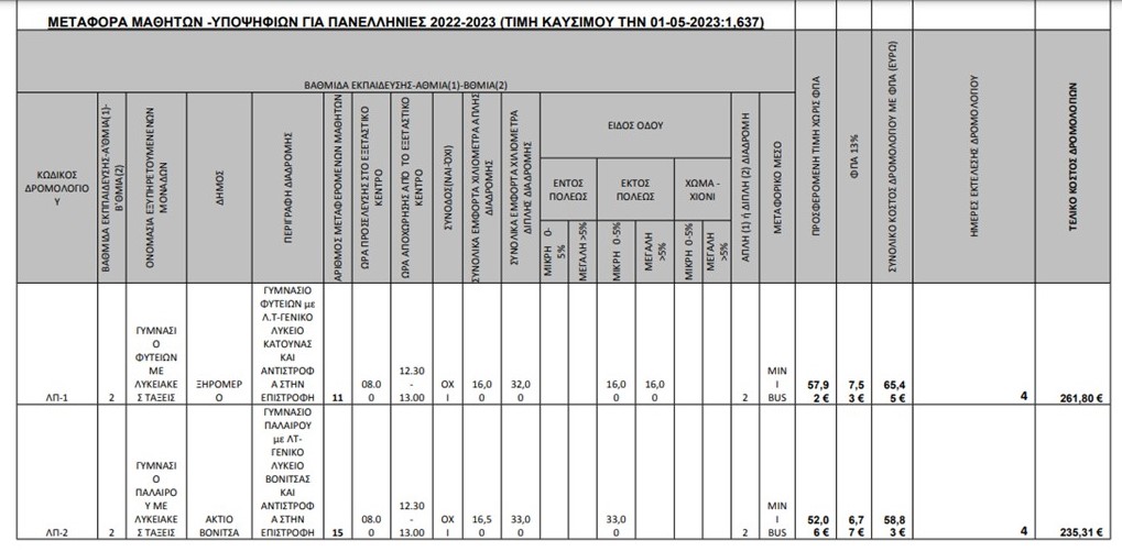 Μετά την αριθμ. 537/2023 απόφαση της οικονομικής Επιτροπής (ΑΔΑ: 9ΥΒΛ7Λ6-ΧΞ6) η Περιφέρεια Δυτικής Ελλάδας πρόκειται να αναθέσει τα συνημμένα δρομολόγια μεταφοράς μαθητών – υποψηφίων Πανελλαδικών Εξετάσεων 2023 χωρικής αρμοδιότητας ΠΕ Αιτωλ/νίας, Δευτεροβάθμιας Εκπαίδευσης σχολικού έτους 2022-2023 σύμφωνα με την παρ. 2β του άρθρου 60 του Ν.4821 (ΦΕΚ 134/τ. Α/31.7.2021) με την διαδικασίας της διαπραγμάτευσης, λόγω κατεπείγοντος σύμφωνα με το άρθρου 32 του Ν.4412/2016, όπως τροποποιήθηκε και ισχύει.