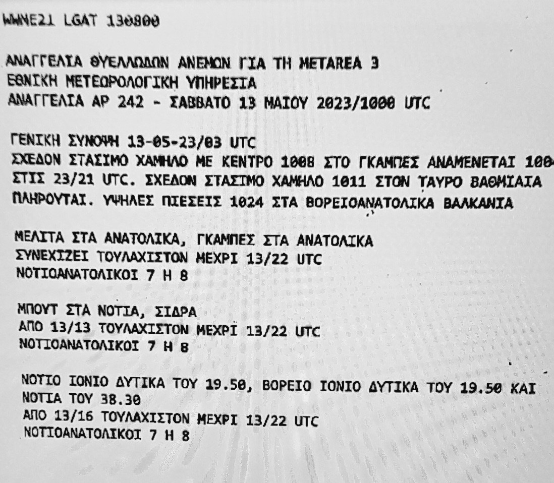 Δελτíο αναγγελίας θυελλωδών ανέμων από Ε.Μ.Υ που αφορά θαλάσσια περιοχή: