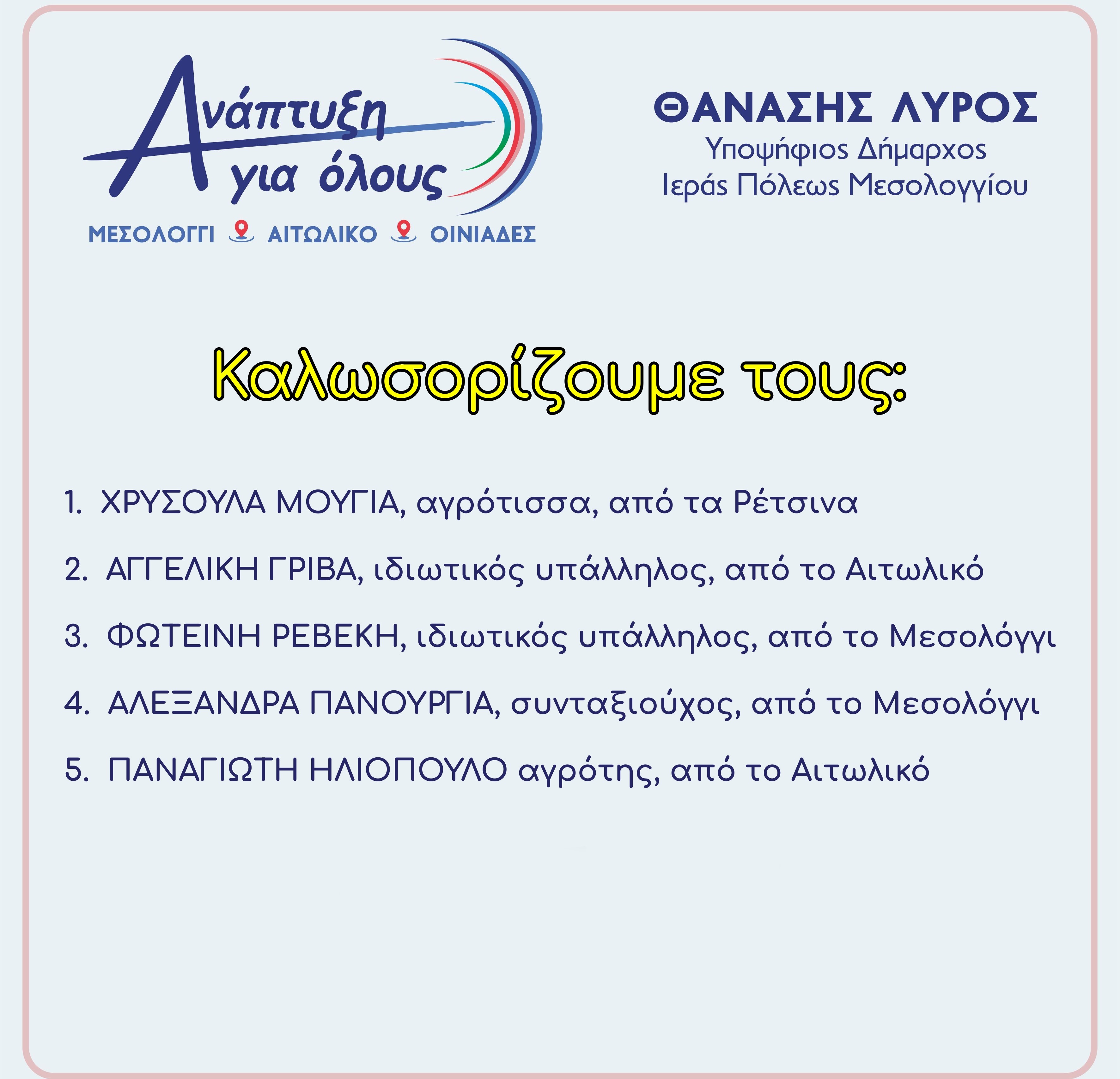 Πέντε (5) νέοι υποψήφιοι συμπορεύονται με τον υποψήφιο Δήμαρχο Ι.Π. Μεσολογγίου, ΘΑΝΑΣΗ ΛΥΡΟ.