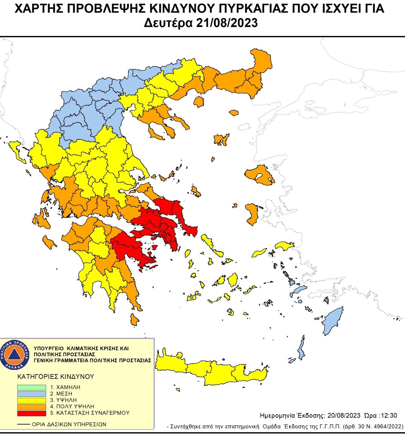 Πολύ υψηλός κίνδυνος πυρκαγιάς (κατηγορία 4) προβλέπεται για την Περιφέρεια Δυτικής Ελλάδας (Π.Ε. Αιτωλοακαρνανίας, Αχαΐας και Ηλείας) για τη Δευτέρα 21 Αυγούστου 2023 σύμφωνα με τον Χάρτη Πρόβλεψης Κινδύνου Πυρκαγιάς της Γενικής Γραμματείας Πολιτικής Προστασίας.