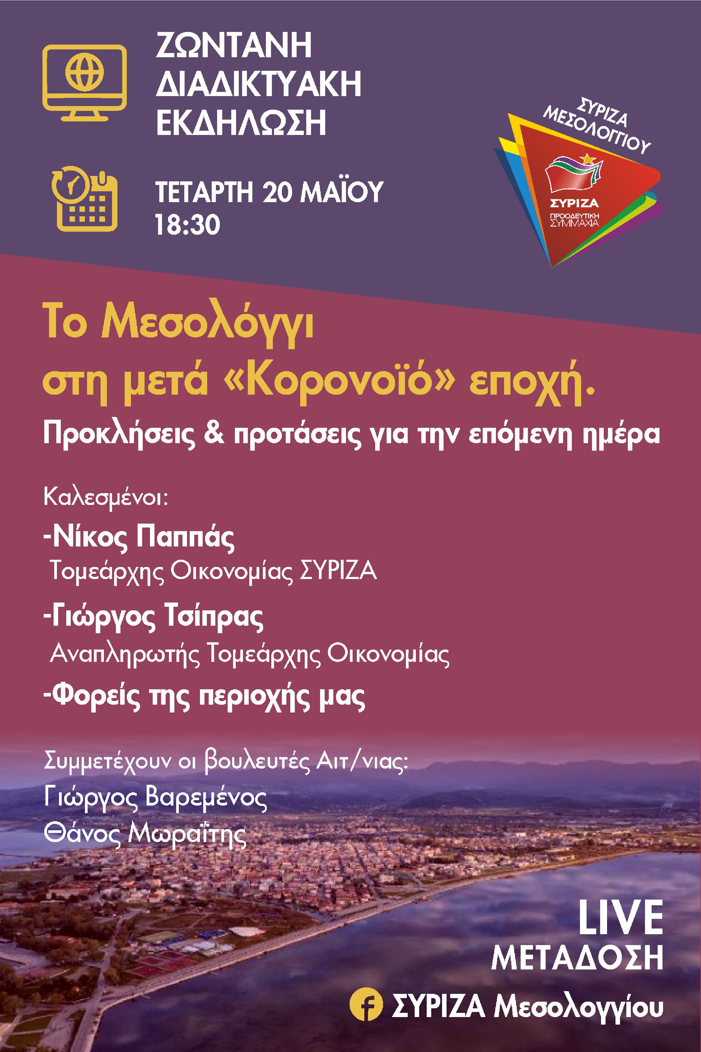 Παρακολουθήστε ζωντανά την Διαδικτυακή Εκδήλωση του Σύριζα Μεσολογγίου «Το Μεσολόγγι στην μετά Κορονοϊό εποχή».