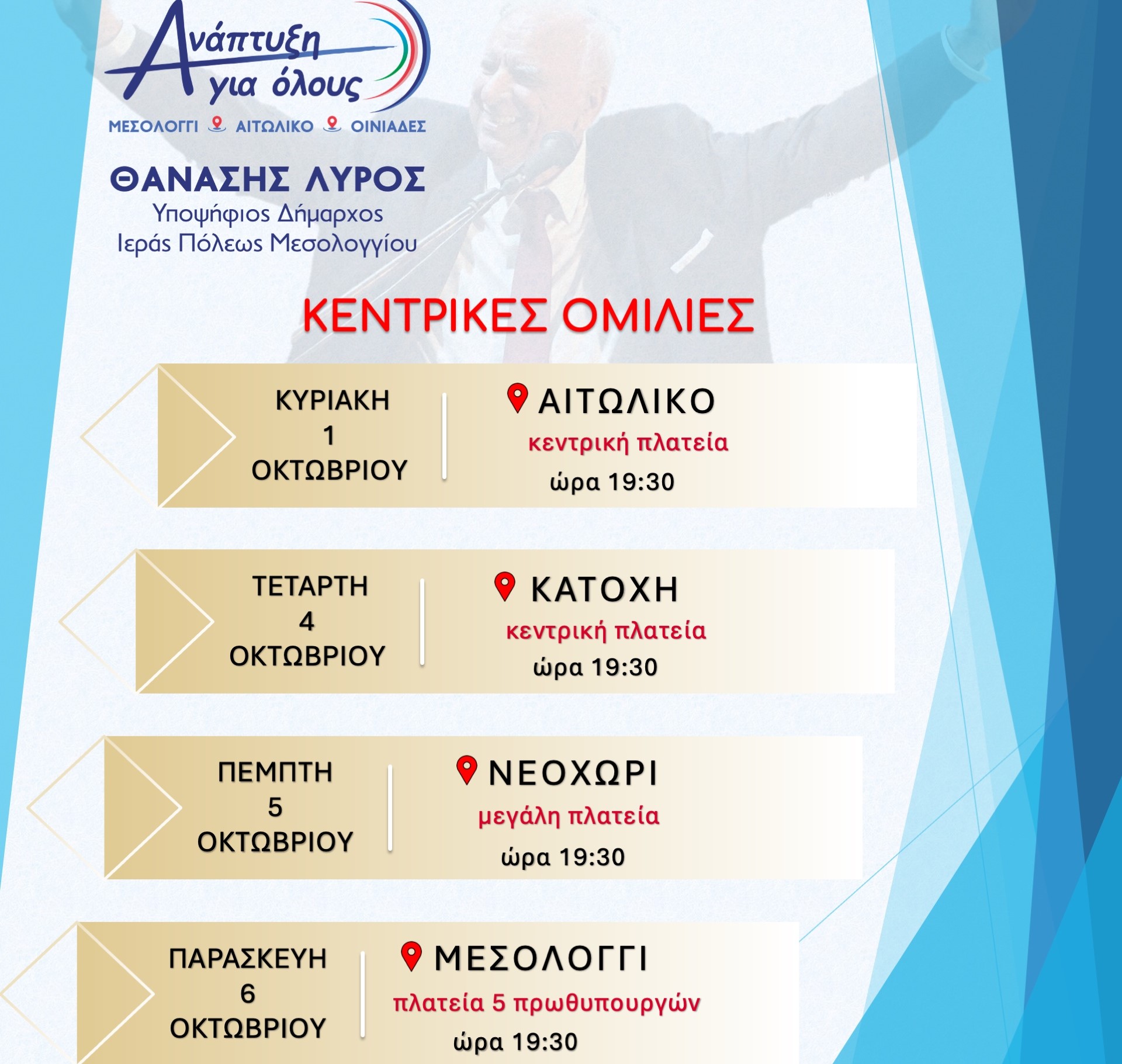 Από το Γραφείο Τύπου τού Συνδυασμού "Ανάπτυξη για όλους" ανακοινώνεται το πρόγραμμα των Κεντρικών Ομιλιών τού επί κεφαλής του Συνδυασμού, υποψηφίου Δημάρχου Ι. Π. Μεσολογγίου, Θανάση Λύρου.