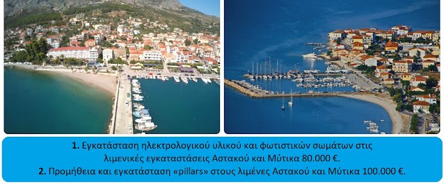 Εγκατάσταση ηλεκτρολογικού υλικού και φωτιστικών σωμάτων στις λιμενικές εγκαταστάσεις Αστακού και Μύτικα 80.000 €.