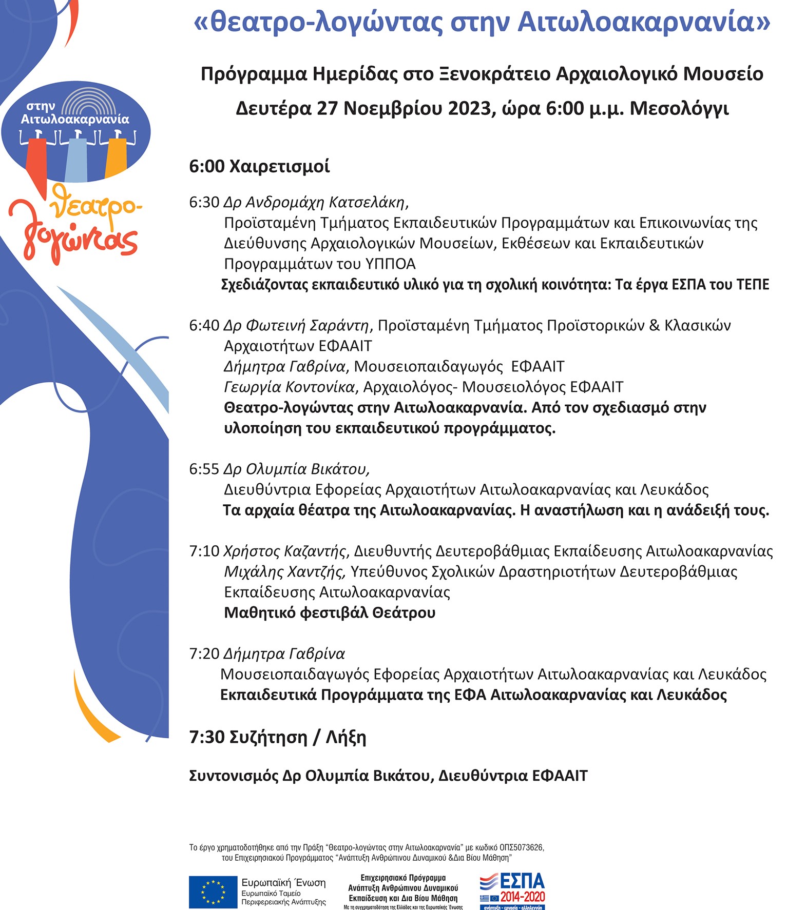 Η Εφορεία Αρχαιοτήτων Αιτωλοακαρνανίας και Λευκάδος σας προσκαλεί στην ημερίδα που διοργανώνει την Δευτέρα 27 Νοεμβρίου και ώρα 6:00 μ.μ., στο Ξενοκράτειο Αρχαιολογικό Μουσείο Ιεράς Πόλεως Μεσολογγίου, όπου θα παρουσιαστεί στην εκπαιδευτική κοινότητα το έργο «ΘΕΑΤΡΟ-ΛΟΓΩΝΤΑΣ ΣΤΗΝ ΑΙΤΩΛΟΑΚΑΡΝΑΝΙΑ», το οποίο υλοποιήθηκε και χρηματοδοτήθηκε μέσω του Επιχειρησιακού Προγράμματος «Ανάπτυξη Ανθρώπινου Δυναμικού, Εκπαίδευση και Δια Βίου Μάθηση».
