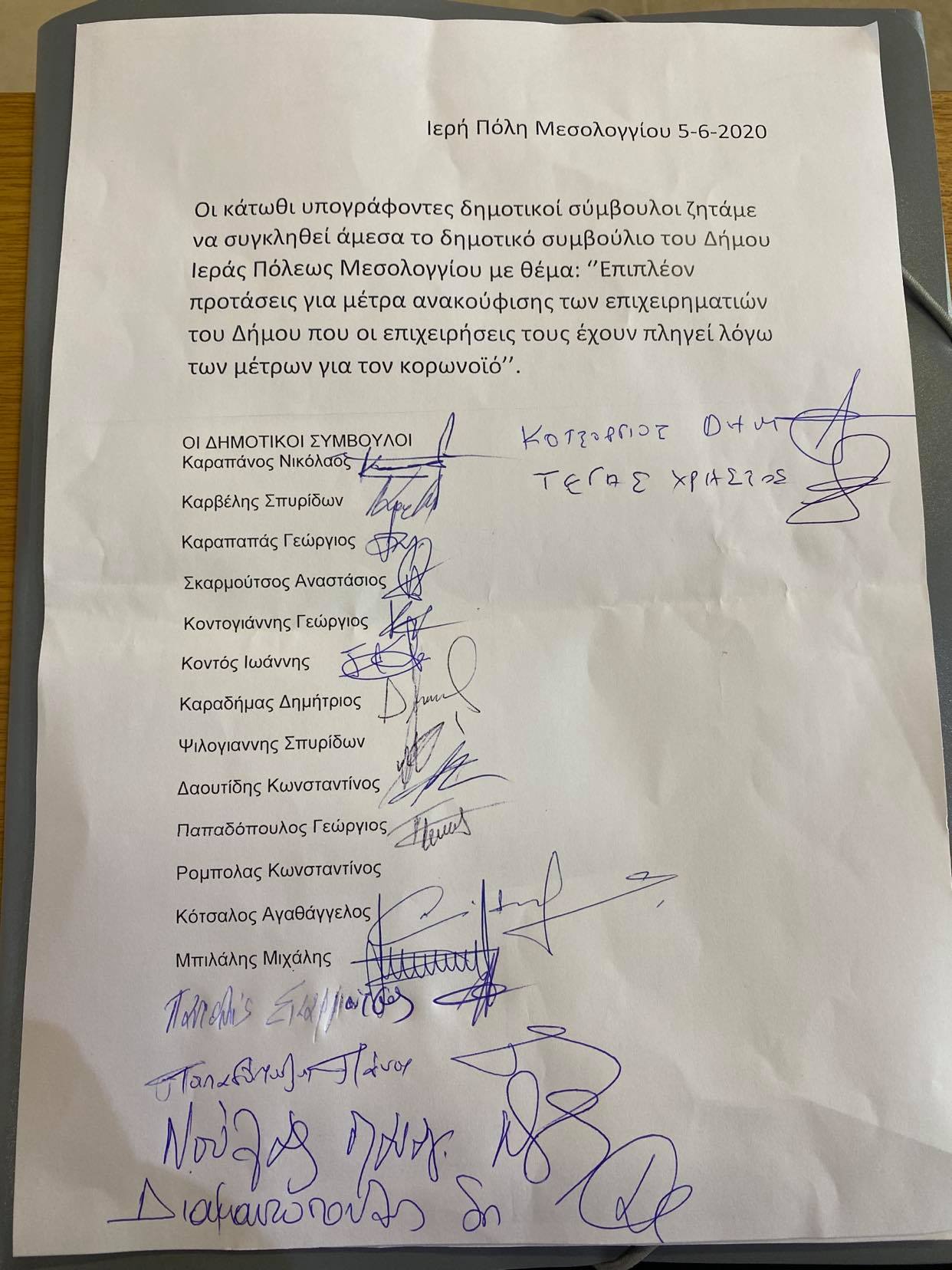 Σύγκλιση του δημοτικού συμβουλίου ζητούν οι παρακάτω 18 δημοτικοί σύμβουλοι με πρωτοβουλία του συνδυασμού «Δήμος για τα παιδιά μας» και του επικεφαλής Νίκου Καραπάνου με σκοπό να κατατεθούν επιπλέον προτάσεις προς όφελος των επιχειρηματιών του Δήμου που έχουν πληγεί εξαιτίας των μέτρων για το κορωνοϊό .