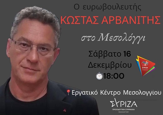 Ο ΣΥΡΙΖΑ ΠΣ Μεσολογγίου καλεί τα μέλη και τους φίλους του, στην εκδήλωση που διοργανώνει με ομιλητή τον ευρωβουλευτή Κώστα Αρβανίτη.
