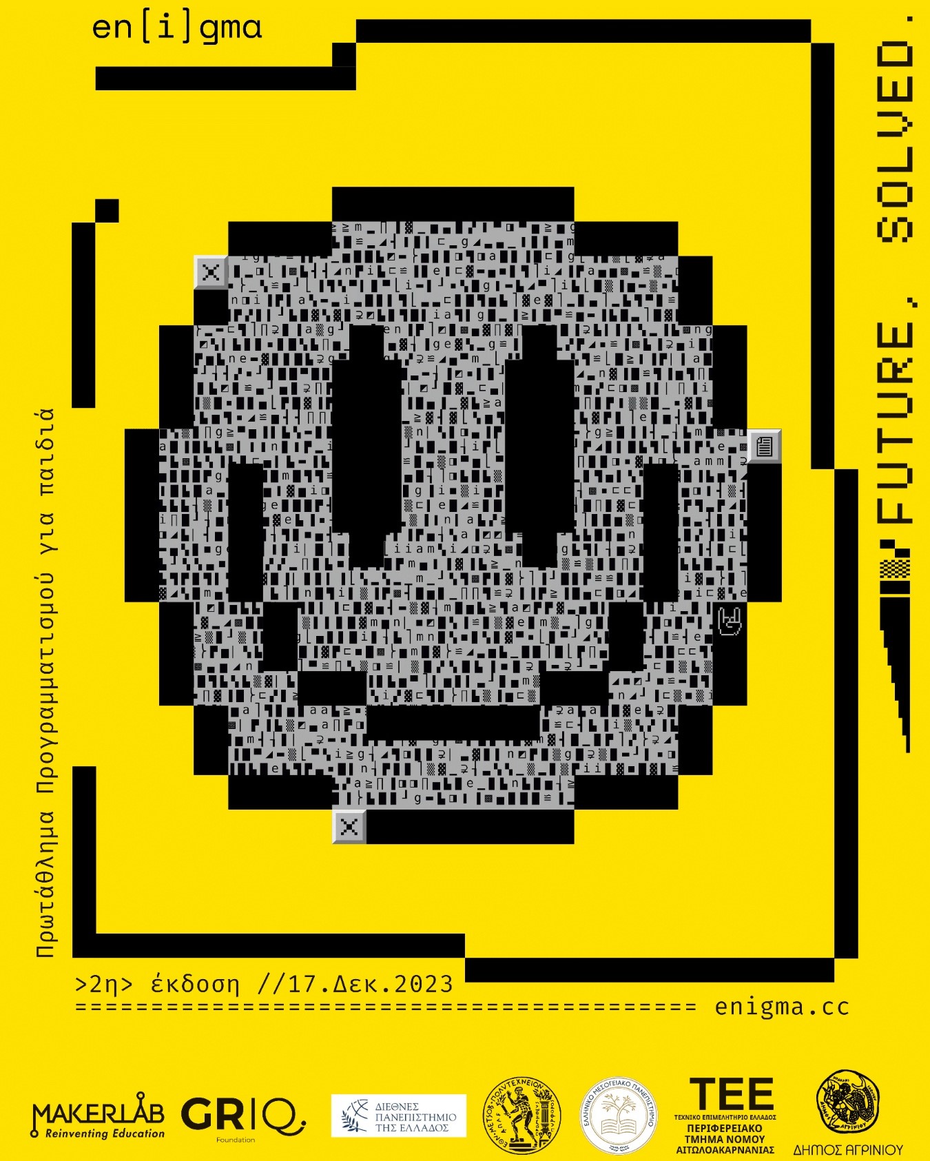 Την Κυριακή 17 Δεκεμβρίου 2023 και ώρα 10:00-13:00 πραγματοποιείται η δεύτερη έκδοση του ετήσιου Πρωταθλήματος Προγραμματισμού en[i]gma στην Ελλάδα υπό την αιγίδα του Δήμου Αγρινίου, του ΤΕΕ Αιτωλοακαρνανίας, της Σχολής Ηλεκτρολόγων Μηχανικών και Μηχανικών Η/Υ του ΕΜΠ και του Τμήματος Μηχανικών Πληροφορικής, Υπολογιστών και Τηλεπικοινωνιών, ΔΙ.ΠΑ.Ε.
