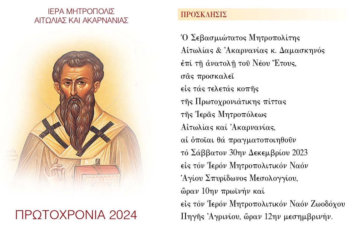 Την Πρωτοχρονιάτικη Βασιλόπιτα της Ιεράς Μητροπόλεως Αιτωλίας και Ακαρνανίας θα ευλογήσει ο Σεβασμιώτατος Ποιμενάρχης μας, Μητροπολίτης Αιτωλίας και Ακαρνανίας κ. Δαμασκηνός, το Σάββατο 30 Δεκεμβρίου 2023.