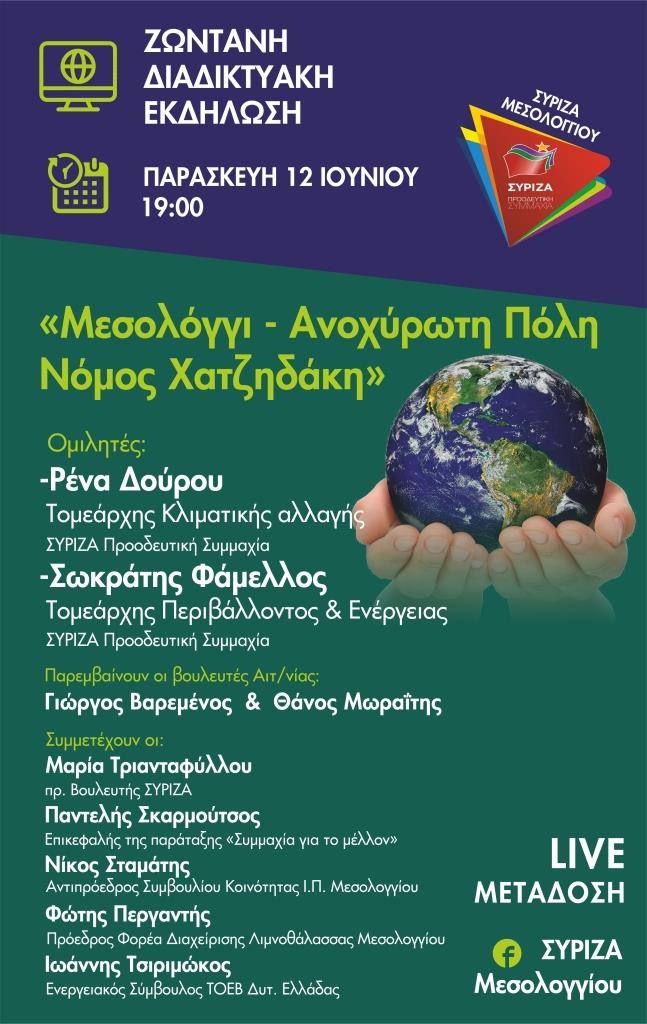 Ο ΣΥΡΙΖΑ – Προοδευτική Συμμαχία Μεσολογγίου θεώρησε επιβεβλημένο να πραγματοποιήσει συζήτηση – εκδήλωση ώστε να ενημερωθούν οι δημότες για τον (αντί)περιβαλλοντολογικό νόμο και για παρεμφερή θέματα όπως η Κλιματική Αλλαγή και οι Ενεργειακές Κοινότητες.