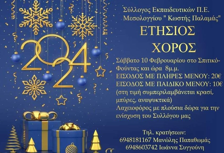Σας προσκαλούμε όλους με χαρά στον Ετήσιο χορό- Κοπή βασιλόπιτας του Συλλόγου μας για το 2024 που θα γίνει στο κέντρο «Φούντας- Το Σπιτικό», το Σάββατο 10 Φεβρουαρίου 2024 και ώρα 20:00.
