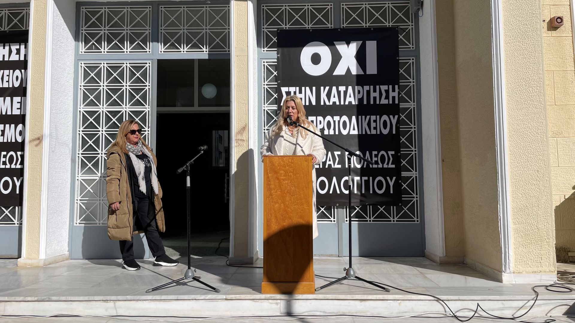 Την ίδια ώρα, έξω από το Δικαστικό Μέγαρο Ι.Π. Μεσολογγίου, λάμβανε χώρα μεγάλη συγκέντρωση πολιτών, δικαστικών και δημοτικών υπαλλήλων, δικηγόρων, καταστηματαρχών και φορέων, κατά του διαφαινόμενου σχεδίου απομάκρυνσης του Πρωτοδικείου.