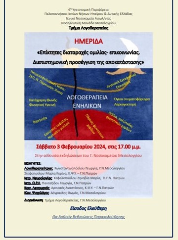 Η Διοίκηση και το Τμήμα Λογοθεραπείας της Ν. Μ. Μεσολογγίου του Γ. Νοσοκομείου Αιτωλοακαρνανίας, σας προσκαλούν στην Ημερίδα με θέμα: «Επίκτητες διαταραχές ομιλίας -επικοινωνίας. Διεπιστημονική προσέγγιση της αποκατάστασης» η οποία θα πραγματοποιηθεί στις 3 Φεβρουαρίου 2024 και ώρα 17.00 μ.μ. στην αίθουσα εκδηλώσεων του νοσοκομείου.