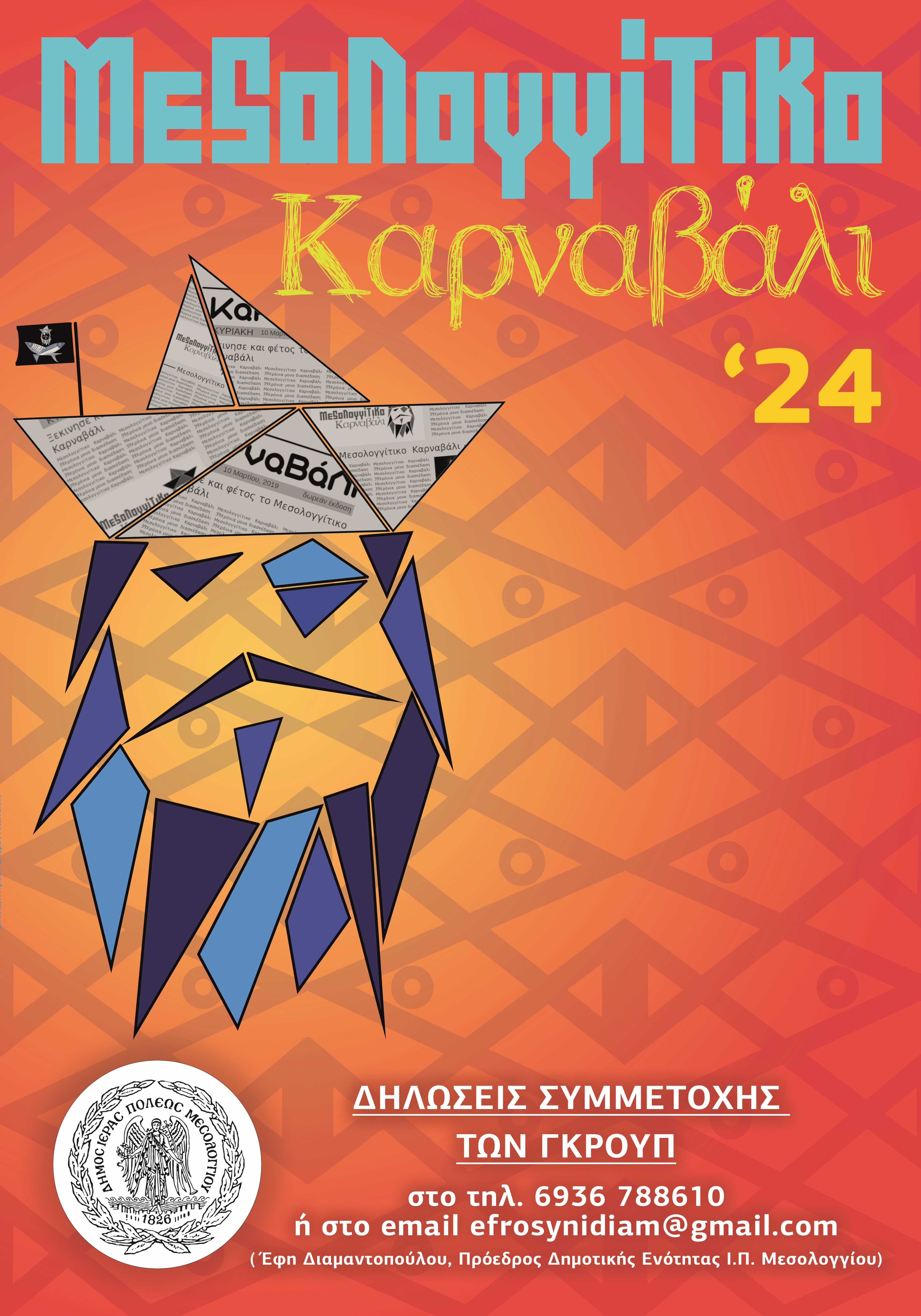 Οι Απόκριες πλησιάζουν και ο συντονισμός για την αναβίωση του Μεσολογγίτικου Καρναβαλιού προχωρά με γοργούς ρυθμούς! Προκειμένου να γίνει ο προγραμματισμός των καρναβαλικών τμημάτων, παρακαλούνται ΟΛΕΣ οι συμμετέχουσες ομάδες να δηλώσουν συμμετοχή το αργότερο έως την επόμενη Παρασκευή, 23 Φεβρουαρίου 2024, στο τηλέφωνο 6936788610 ή στο email efrosynidiam@gmail.com (Έφη Διαμαντοπούλου, Πρόεδρος Δημοτικής Ενότητας Ι.Π. Μεσολογγίου).