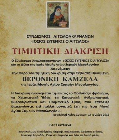 Ακολούθησε μια απλή, σεμνή  και λιτή εκδήλωση, έτσι ακριβώς όπως άρμοζε στην Ηγουμένη Βερονίκη, από τον  Σύνδεσμο  Αιτωλοακαρνάνων «ΟΣΙΟΣ ΕΥΓΕΝΙΟΣ Ο ΑΙΤΩΛΟΣ» και τους φίλους του Μοναστηριού. Ο Σύνδεσμος, δια του Προέδρου του, παρέδωσε Τιμητική Διάκριση τιμώντας την Ηγουμένη Βερονίκη Καμζέλα, για το  Ορθόδοξο φρόνημα, το Χριστιανικό  Ήθος, το Κοινωνικό, Ανθρωπιστικό, Φιλανθρωπικό και Ποιμαντικό της έργο, που επέδειξε διακονώντας επί πολλά έτη την Ιερά Μονή του Αγίου Συμεών – Μεσολογγίου.